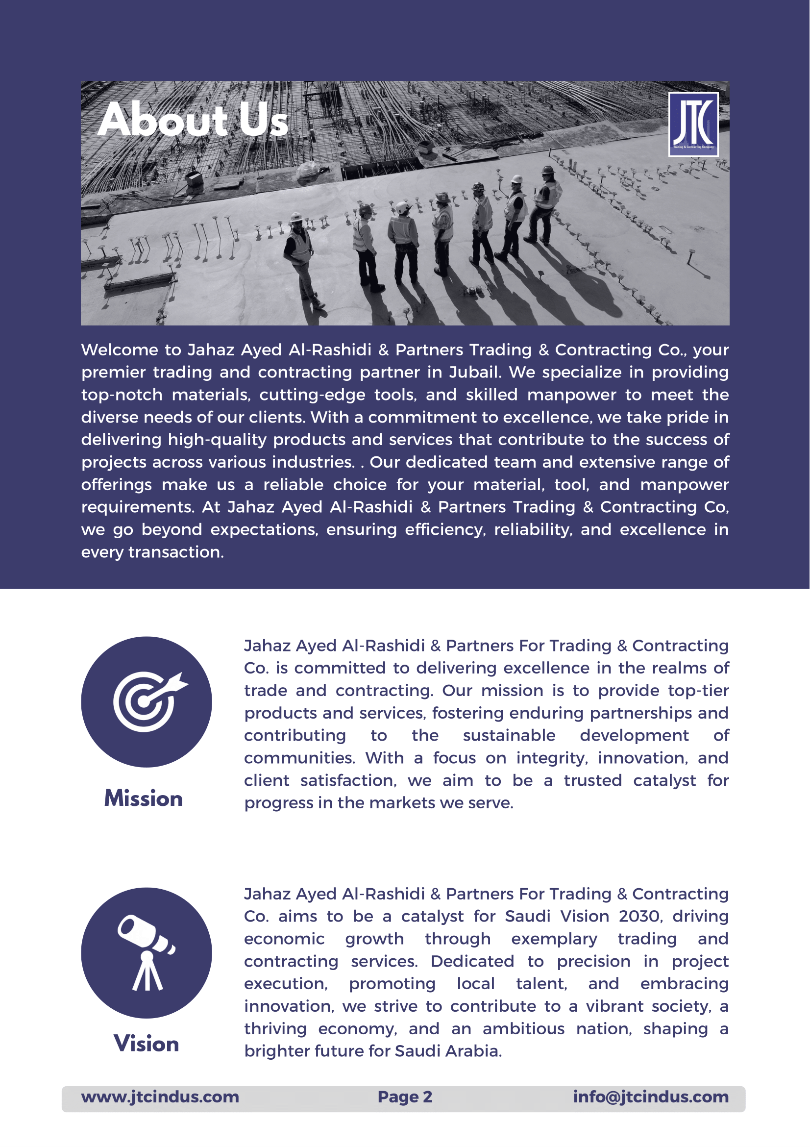 At Jahaz Ayed Al-Rashidi & Partners For Trading & Contracting Co., our vision is to catalyze Saudi Vision 2030 by driving economic growth through exceptional trading and contracting services. We are dedicated to achieving this by maintaining a steadfast commitment to precise project execution, which is further strengthened by our efforts to develop local talent and foster innovation. Our goal is to significantly contribute to societal enrichment, bolster economic strength, and advance our nation. By prioritizing indigenous talent and promoting innovation, we strive to surpass Vision 2030 objectives, shaping a prosperous future for Saudi Arabia. Our comprehensive approach ensures that we make positive and lasting contributions to socio-economic development, thereby leaving a profound impact on sustainable progress and national prosperity.